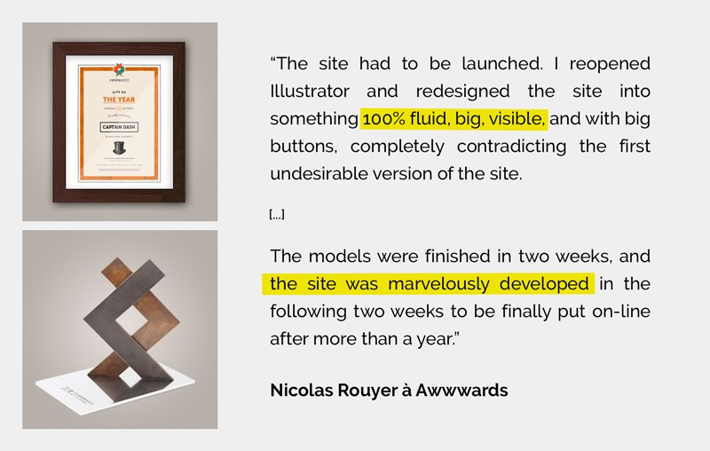 Designé puis développé avec soin, le site est élu Site of the Day par Awwwards, la référence du domaine. Mais le succès ne s'arrête pas là. A la fin de l'année, le site devient Site of the Year Users' Choice de 2012.