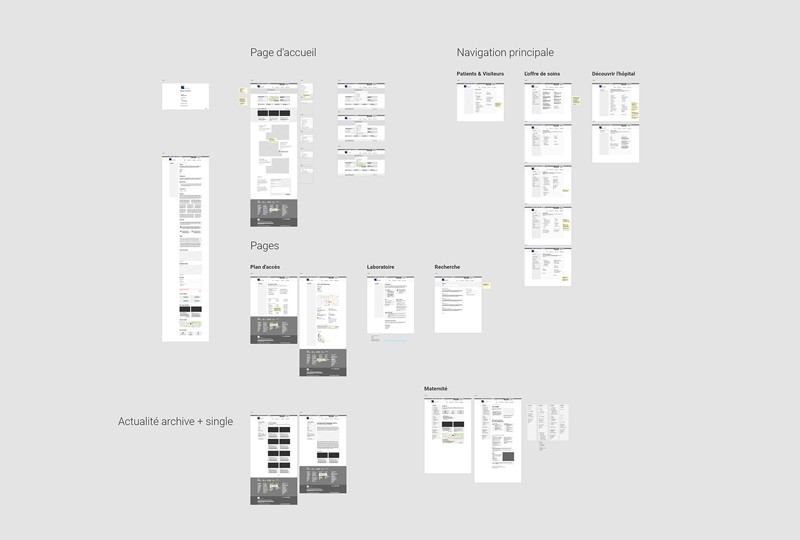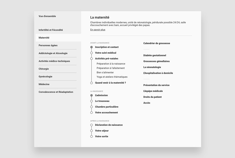 L'un des enjeux majeurs de l'appel d'offre était la représentation du parcours patient au sein du site internet. La solution proposée a été d'organiser les pages de chaque rubriques en découpant les grandes phases (avant, pendant, après) et en présentant les sous-étapes avec un fil conducteur reprenant le principe des plans de métro.