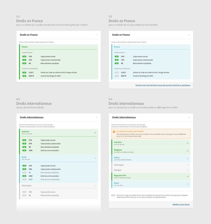 Après avoir déconstruit le modèle, j'ai proposé des principes graphiques apportant clarté et lisibilité : un entrée par pays puis droits (à l'inverse du SI) et des codes couleurs selon les droits gérés dans chaque bloc (complet, partiel et vide devenant vert, bleu et gris).